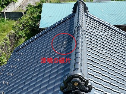 現地に伺うと、お客様が気にされていた「屋根の上の白い物体」は、漆喰が剥がれて落ちてきた破片でした。