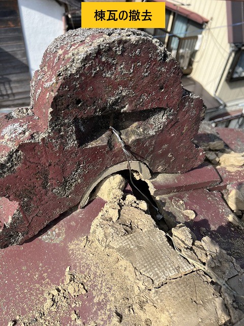 既存の棟瓦と劣化した漆喰を丁寧に撤去します。