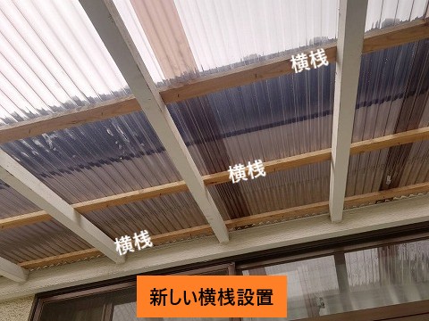 また、木製の下地部分(横桟)にも傷みが見られ、波板をしっかり固定できない状態になっていました。