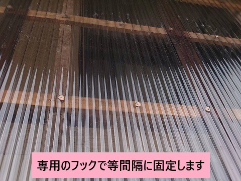 ポリカーボネートの波板は、等間隔で専用のフックを使用してしっかり固定していきます。