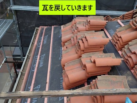 さらに桟木を設置し、瓦を元通りに葺き直していきます。
