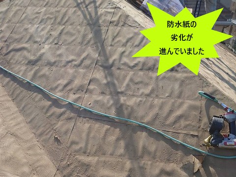 瓦を撤去してみると、防水紙はやはり劣化が進んでおり、本来の防水機能が低下している状態でした。